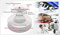 日產汽車一直希望制造出最好的汽車產品。但是銷售前的"出廠質量"與顧客實際體驗的"市場質量"之間有時存在微小的差異,因此有必要迅速消除這種差異,明確掌握現場的情況。在市場品質解析中心(FQC)中一直都奉行稱為"現場、現物、現實"的三現主義。這是一種通過面對實際中出現問題的零部件與汽車,重現現象加深現實理解的活動。