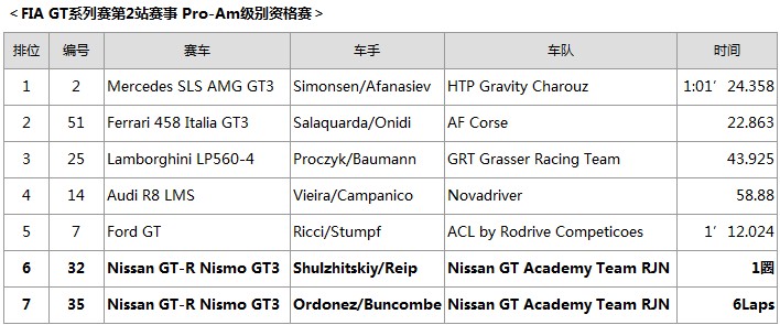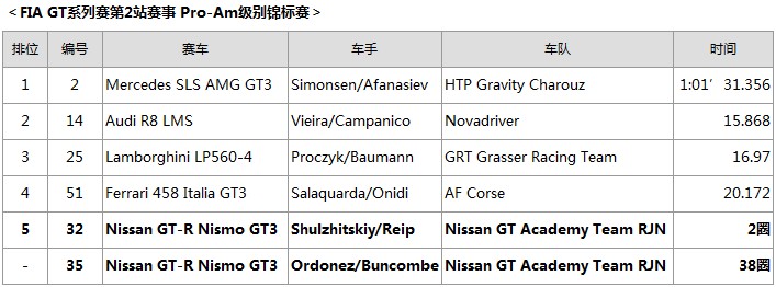 來自比利時的Wolfgang LAIB和來自俄羅斯的隊友Mark Shulzhitskiy在預賽中從第17位的位置起步,中途成功避開各種事故,最終獲得第15名。在決賽中,Mark Shulzhitskiy在首圈中就陷入激烈的競爭中,但是,當他駕駛#32 NISSAN GT-R NISMO GT3賽車擺脫其他賽車進站維修并重返賽道后,他開始恢復至原來的圈速,接手的Wolfgang LAIB最終獲得綜合成績第4名,在Pro-Am級別中名列第5。