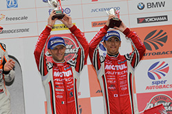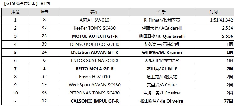 另外,Ronnie Quintarelli以預(yù)賽第11名的成績駕駛#23 GT-R起步。在前半程賽事中,持續(xù)與#24 GT-R展開激烈競爭,因此加速了輪胎的磨損。在第19圈的彎道頂點中一舉超越#24 GT-R,使得排位上升至第8位。在第30圈時為交接賽車和更換輪胎,Ronnie Quintarelli駕駛賽車進(jìn)入維修站。柳田真孝駕駛賽車重返賽道后,由于前方賽車剮蹭等導(dǎo)致某些情況變動,另外加上降雨,使得賽道出現(xiàn)混亂情況。盡管如此,順利跑圈的#23 GT-R一鼓作氣將排位提升至第6位。在臨近賽事結(jié)束時,由于處于第一集團(tuán)的賽車出現(xiàn)打滑等現(xiàn)象導(dǎo)致掉隊,#23 GT-R在第81圈時奮勇沖過終點,最終奪得第3名。另外,以預(yù)賽第9名的成績起步的#24 D'station ADVAN GT-R(安田裕信/Michael Krumm)由安田裕信擔(dān)任首發(fā)車手,安田裕信一直保持穩(wěn)定的節(jié)奏堅守排位,在第30圈進(jìn)站維修時與Michael Krumm進(jìn)行了賽車交接。Michael Krumm負(fù)責(zé)較長賽道(負(fù)責(zé)圈數(shù)),最終奪得第5名。他感慨地說:“比賽臨近尾聲時下雨,我駕車進(jìn)站維修并更換了輪胎,面對半濕的路面輪胎充分發(fā)揮了性能,最終我以第5名的成績完成比賽,感覺很好。”