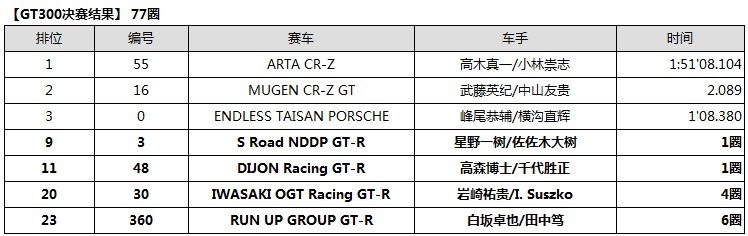 在有4輛NISSAN GT-R NISMO GT3參賽的GT300級別賽事中,以預(yù)賽第5名成績起步的#3 S Road NDDP GT-R(星野一樹/佐佐木大樹)最終奪得第9名,其他3輛賽車最終也堅持完成比賽。