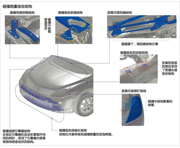 碰撞中可能跟行人接觸的車輛部件,為了更好的吸收碰撞能量,被設(shè)計(jì)為更容易變形或脫離。這只是日產(chǎn)公司正在實(shí)施的減少行人傷害眾多方法中的一種。