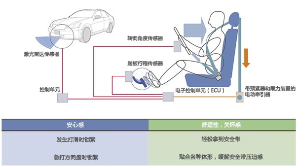 與以往的安全帶相比,智能安全帶更具安全性。通過發動機卷收器來控制安全帶,在提高安全感和舒適性的同時,更增加了一種關懷感。