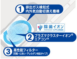 讓空調(diào)吹出的風之中帶有高濃度離子,在抑制浮游菌等、減少附在內(nèi)飾上的臭氣同時,保持肌膚的濕潤。(※2)內(nèi)外氣體自動切換裝置不僅具有廢氣探測功能,還可探測車外家畜及工廠的臭氣,將受污染帶有臭味的空氣阻擋在車外。