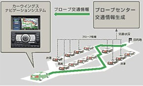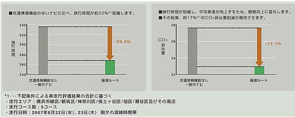這是實際的行駛結果。綠色路線是參考了交通信息的的路線,煙灰色路線是沒有參考交通信息的路線。從神奈川縣橫濱市出發至東京都町田市的例子中,參考了交通信息選擇最快路徑的人可早到約40分鐘。