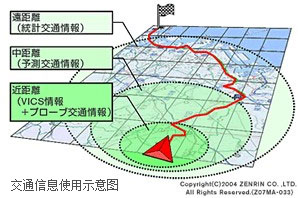 最快路徑探測是指將從本車位置到目的地之間的距離分為3段,根據正確的交通信息在每個區域探索路徑。 在每個區域中利用的交通信息如下所示。 在本車位置附近的近距離區域中使用作為實時交通信息的VICS信息,在VICS信號未覆蓋的公路上使用探測實時交通信息;在中等距離區域中以VICS信息為主, 使用實時預測通過時刻的交通狀況的預測交通信息;在遠距離區域中使用對日常交通狀況進行統計處理之后的統計交通信息,然后結合這些交通信息探測路徑。