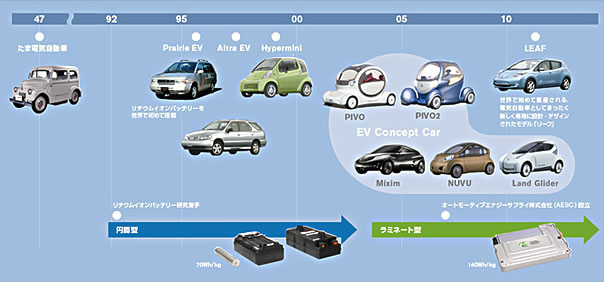 日產為了實現未來可持續發展的汽車社會,不僅考慮提高使用傳統內燃機的汽車油耗性能,而且還考慮必須發展電動車及燃料電池車等零排放車輛。因此日產率先致力于研發電動車以及關鍵技術的電池。 日產與戰略聯盟伙伴雷諾以成為零排放車行業的領軍者為目標,計劃于2010年12月在日本及美國投放日產LEAF,還計劃在2011年初在歐洲投放該車型,2012年在全球上市。