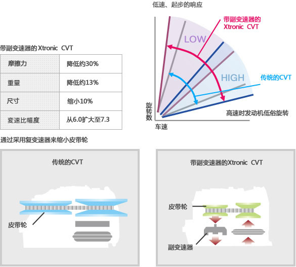 相對傳統的系統,降低了摩擦力和重量,尺寸也實現了小型化。同時大大地拓寬了變速比幅度。另外,通過新采用副變速器,成功實現了CVT皮帶輪的小型化。從而,大幅度實現了輕量化。而且,通過增大變速比,提高了變速響應速度和燃油經濟性。