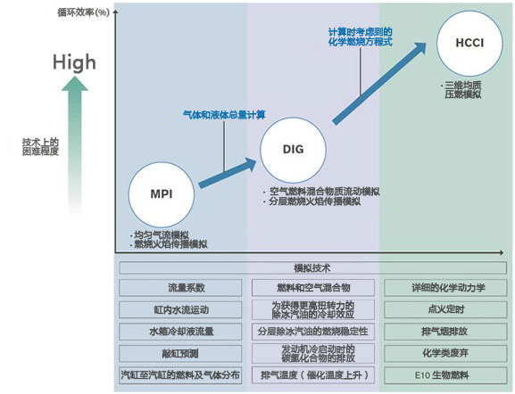 在提高循環效率時,考慮到燃燒狀態的重要性,需要對變化的燃燒進行模擬。直至目前,日產有開發出各種模擬技術。在開發兼具燃油經濟性和清潔尾氣雙重優點的均質混合氣壓燃燒技術(HCCI)上,基于一直以來不斷積累的關于燃燒的基礎數據和技術,開發出了使復雜的化學反應過程3D模擬高速化的HCCI燃燒模擬技術。