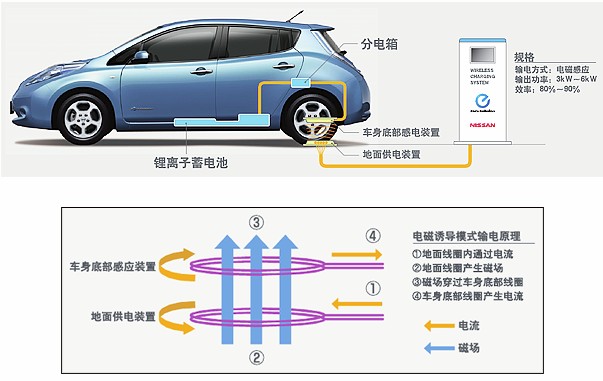 日產汽車公司在該系統中使用"電磁誘導模式"。日產汽車公司的獨有技術使該系統的充電效率達到了有線充電模式的80%一90%。電磁誘導模式的原理為,地面供電裝置內部的線圈通電,電流產生磁場,該磁場使車輛底部的感應裝置線圈產生電壓,從而完成充電。充電時,車輛停車位置并不受嚴格限制,即便不完全停在定位點,也可實現充電。