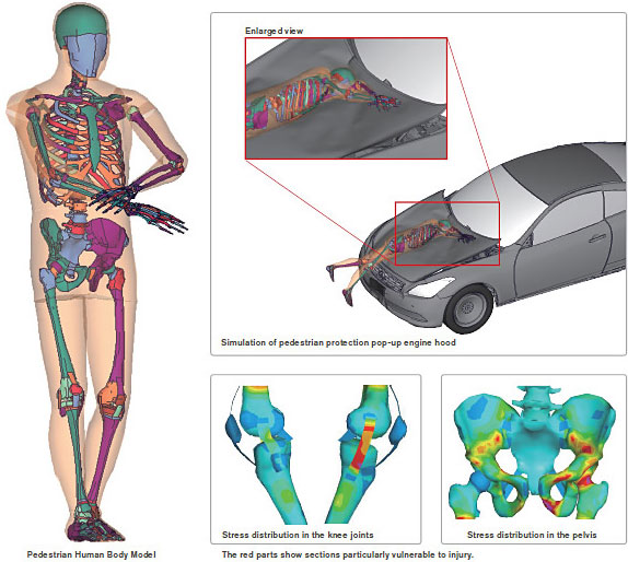 除了通過人體模型實驗評估行人保護性能外,還在模擬試驗中使用忠實再現人體骨骼、肌肉及韌帶等的人體模型,詳細解析傷害產生的機制原理,幫助研究開發更具效果的行人保護系統。