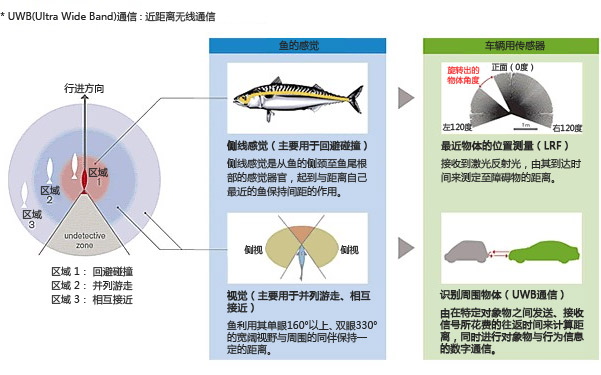 魚主要是以"側線感覺"和"視覺"作為傳感器來識別周圍的狀態。利用測量激光的反射光至障礙物距離的"激光測距儀"( LRF),實現了"側線感覺"的作用。此外,利用由發送脈沖信號并得到反射的時間差來測量對象物位置的 "UWB(超寬帶)通信技術*",實現了"視覺"的作用。將這兩個周圍環境識別技術和魚群游走三原則(回避碰撞、并列游走、相互接近)相結合,運用在機器人汽車上,就可以形成如同魚群一樣自由改變隊形的行駛。* UWB(Ultra Wide Band)通信:近距離無線通信。