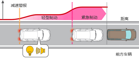 如果系統判定與車輛前方的車輛或行人存在相撞的風險,它將通過視覺和音頻警報來提醒駕駛員,并進行輕型自動制動。這是為了提示駕駛員采取措施避免碰撞。